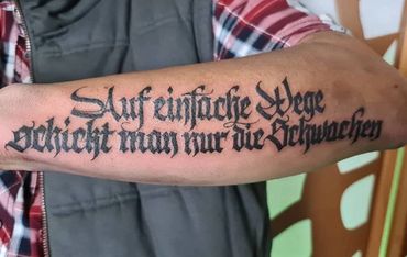 Da ich mich schon sehr lange mit Schriften beschäftige und seit teenager Tagen grosses Interesse an der Kunstform des Tätowierens habe, habe ich mich 2017 dazu entschlossen das Refugium Monumentum Tattoo Art Aachen ins Leben zu rufen. Mit meiner ca. 30 jährigen Erfahrung im Bereich Schriftdesign, ob Kalligraphie, Lettering, Script und Graffiti entstehen individuelle Unikate. Ein Suchmaschinen ’copy and paste‘ gibt es bei mir nicht. Auch im Bereich black and grey Tätowierungen, illustrativ bis realistisch, bin ich zu Hause- somit ist für fast jeden etwas im Repertoire vorhanden. Mit handwerklichem und künstlerischem Können helfe ich Dir deine einzigartige Geschichte auf deiner Haut zu zeigen- Ein Spiegelbild deiner Persönlichkeit, eine Vision, die durch unsere Zusammenarbeit verwirklicht wird.